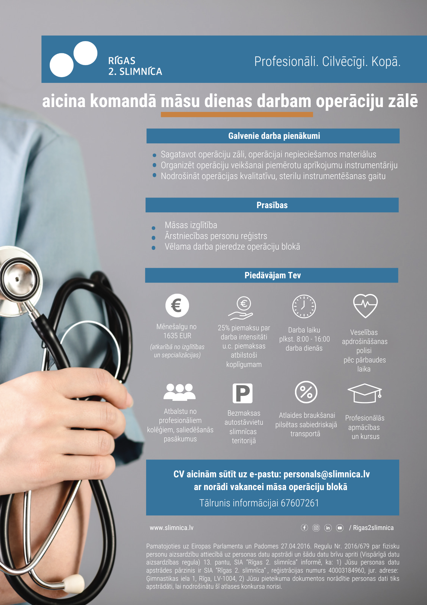 Papildu informācija: Piemaksa par darba intensitāti 25%, u.c. piemaksas atbilstoši darba likumdošanai un koplīgumam (par darbu nakts stundās, svētku dienās, virsstundu darbu, par darba stāžu), Veselības apdrošināšanas polisi pēc pārbaudes laika