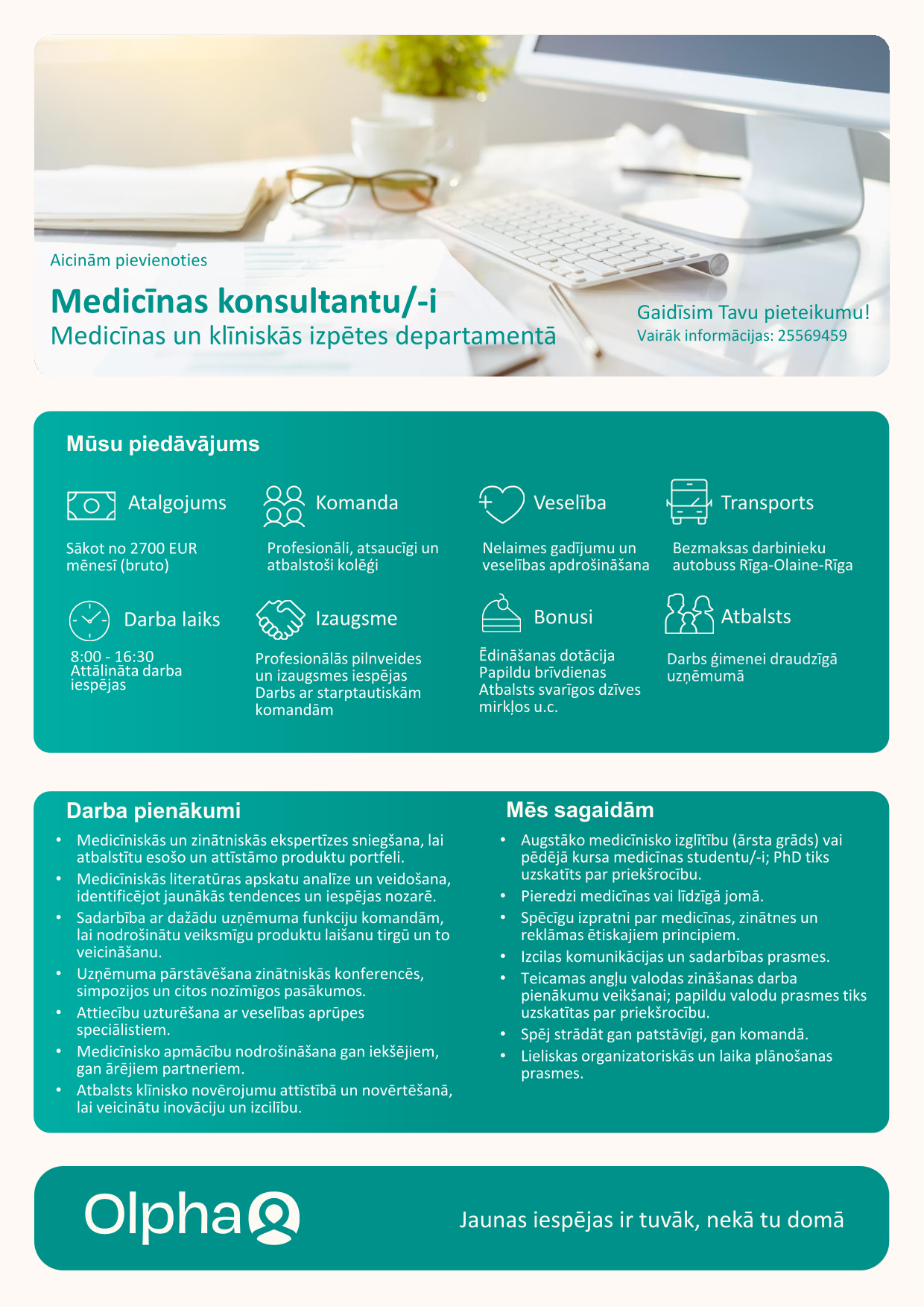 Olpha ir viens no lielākajiem uzņēmumiem Baltijas valstīs ar 50 gadu pieredzi zāļu un ķīmiski farmaceitisko produktu ražošanā. Olpha grupā strādā 1400 cilvēku liela komanda no visas pasaules.Šī gada jūnijā uzņēmums veica zīmola maiņu, un daudziem labi pazīstamais Olainfarm pārtapa par Olpha. Uzņēmuma attīstības stratēģija paredz no reģionāla spēlētāja izaugt par starptautisku farmācijas kompāniju, un Olpha mērķis ir kļūt par vienu no desmit vadošajām farmācijas kompānijām Eiropā savās terapeitiskajās grupās.Pievienojies Olpha, lai palīdzētu īstenot misiju padarīt veselības aprūpi sasniedzamu.