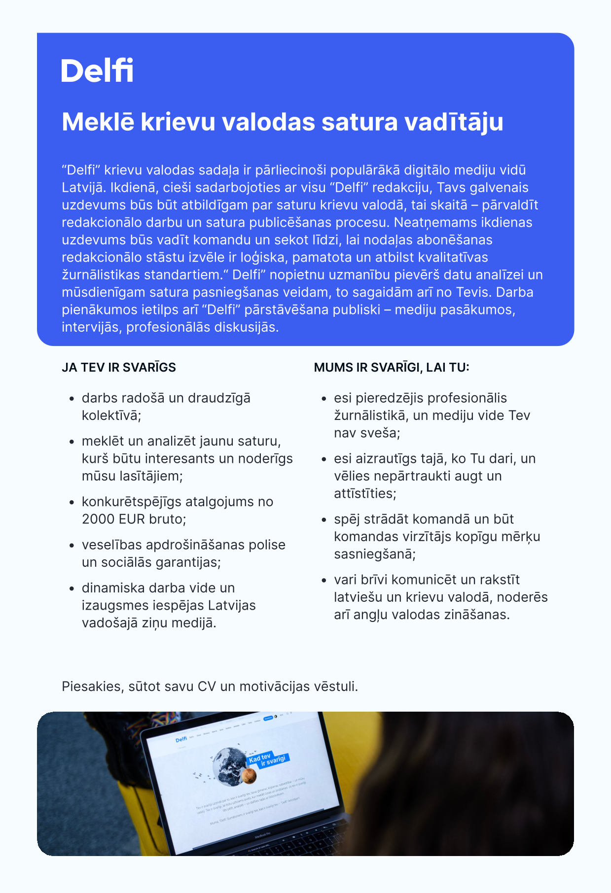 Delfi ir Latvijas vadošais ziņu medijs, kam uzticas un kuru kā galveno ziņu avotu par notikumiem Latvijā un pasaulē izmanto lielākā daļa Latvijas interneta lietotāju, mēnesī vidēji 900 000 unikālo apmeklētāju. Delfi piedāvā daudzveidīgu, profesionālu žurnālistu veidotu saturu dažādos formātos. Lietotāji atzinīgi novērtējuši arī plašo dzīvesstila informācijas piedāvājumu un iespēju abonēt originālsaturu iegādājoties Delfi Abonementu. Lepojamies ar vairākām nozares balvām, tostarp Latvijas Žurnālistu asociācijas izcilības balvām un Zīmolu topa novērtējumiem par Mīlētāko mediju zīmolu Latvijā un Baltijā.